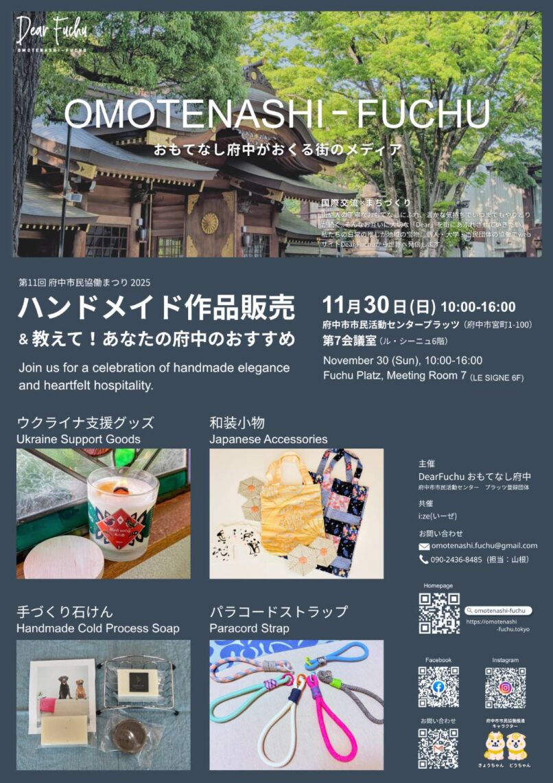 11月302025 ハンドメイド 協働まつり 第11回府中市民協働まつりに出展 おもてなし府中は府中市民協働まつりにてハンドメイド作品販売いたします。 <開催日時> 2025年11月30日(日)府中市市民活動センタープラッツ ル・シーニュ6階 第7会議室 10時~16時